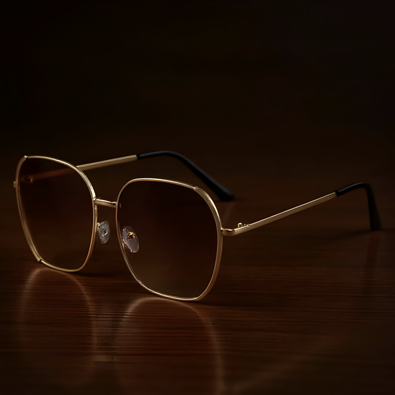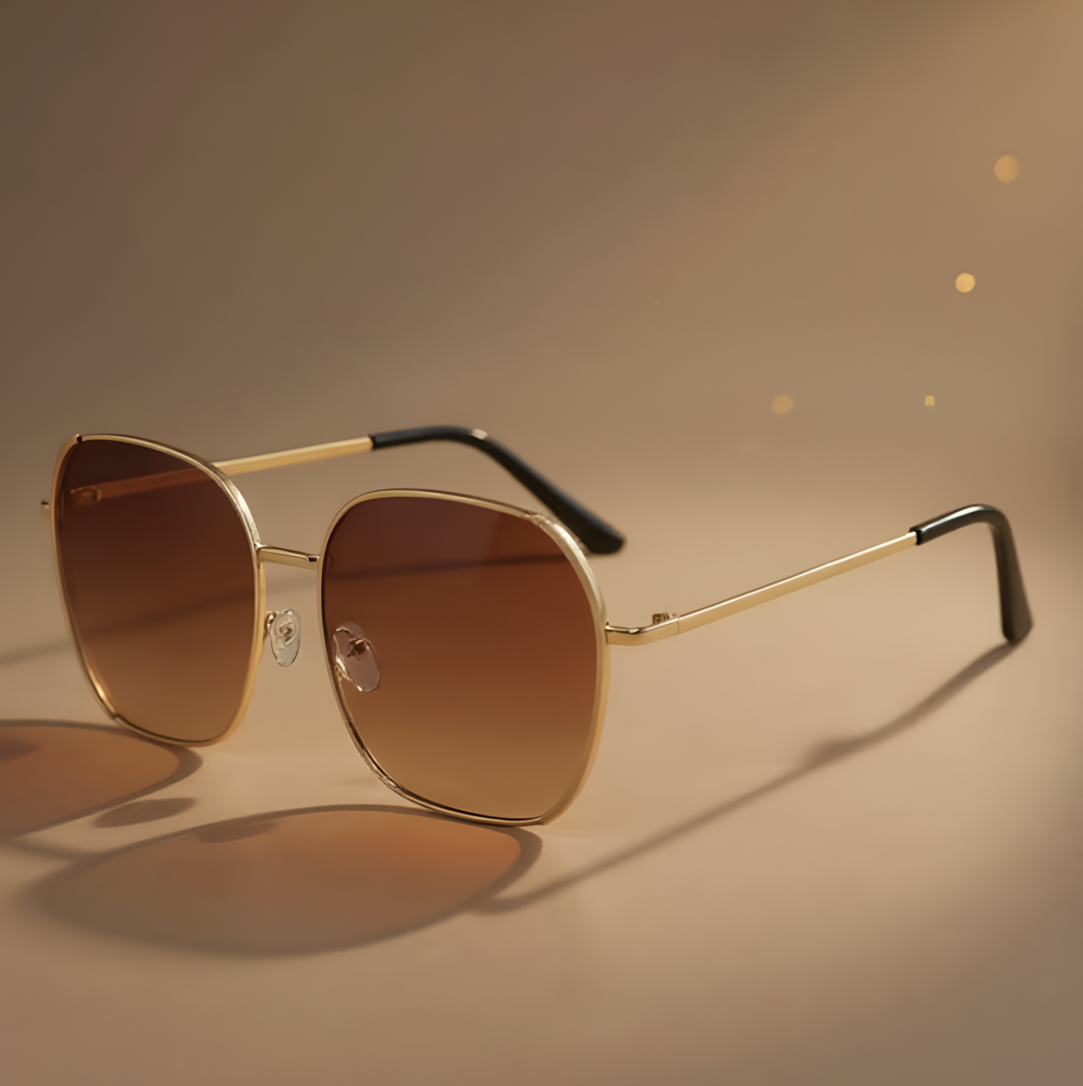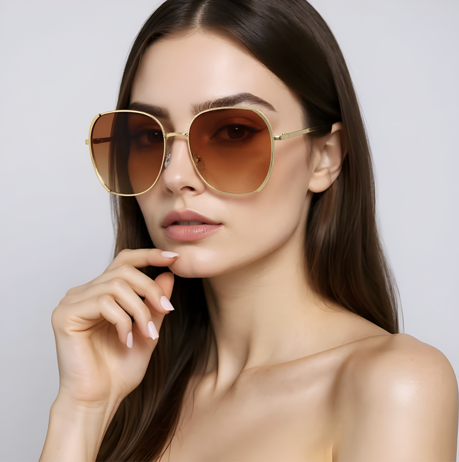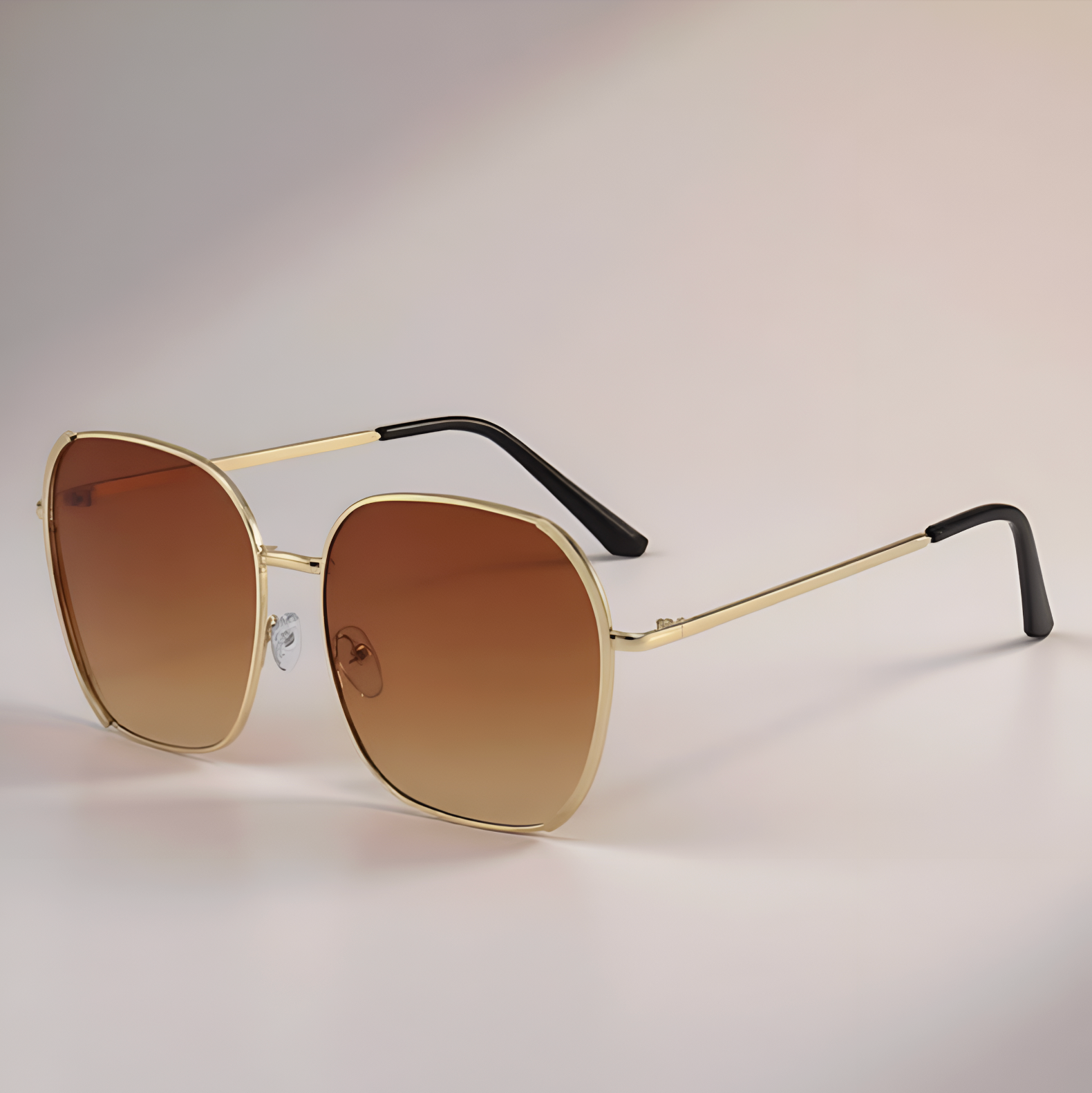 Gafas de sol con aros tipo exagonal oversized, fabricados en Metal, con marco en color dorado y cristales color dorado, que ofrecen un equilibrio perfecto entre estilo moderno, ligereza y confort visual.